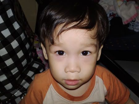 Benfred went for a haircut yesterday. His hair is too long and messy. It is really hard for him to have a good hairstyle cause' his hair is damn curly. He should look more alright now without the messy hair. Yesterday when the auntie tried to cut his hair, he kept turning around to see what the auntie was doing. Hard to make him keep still. Luckily he didn't turn alot, if not his hair might be ruined by now.
